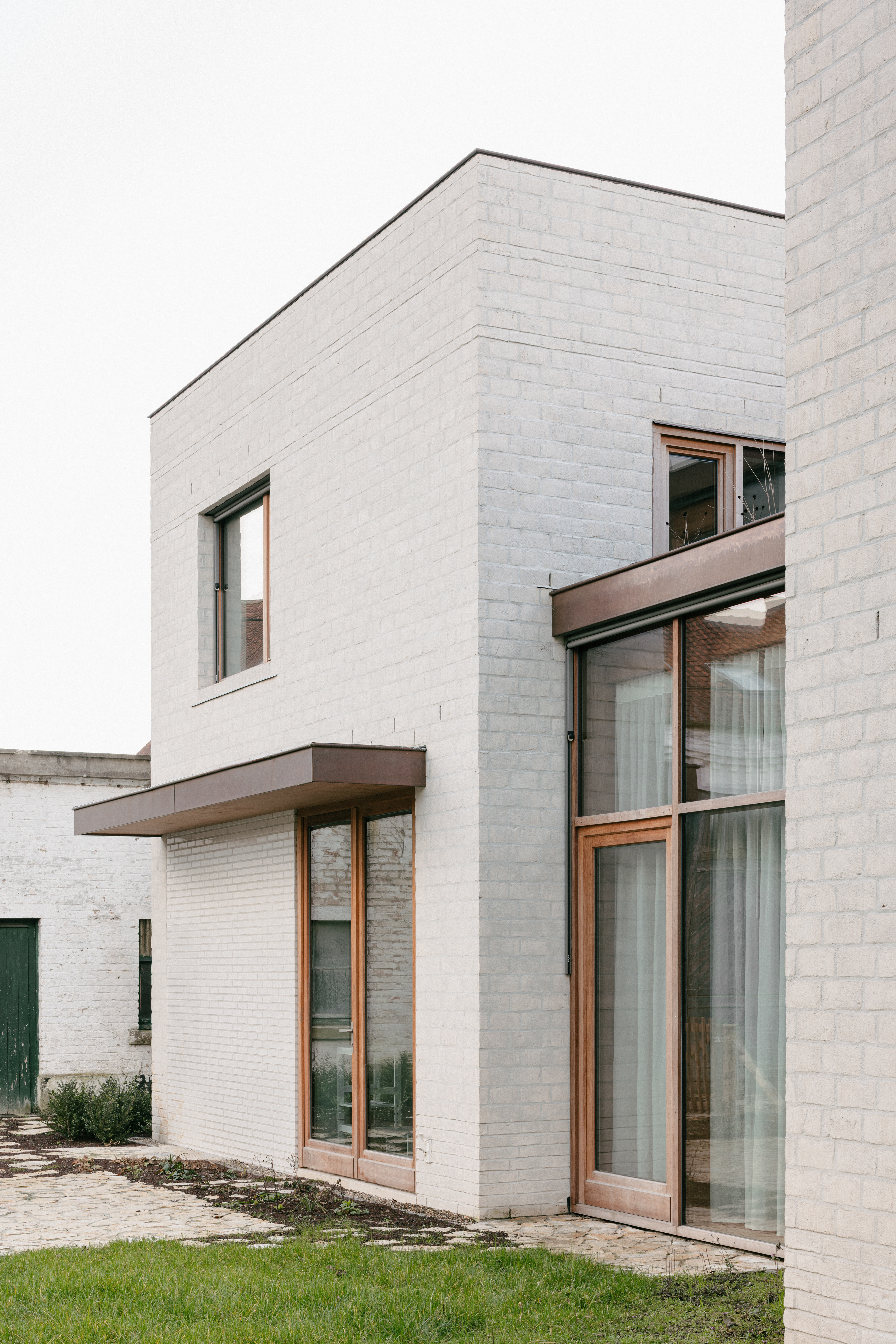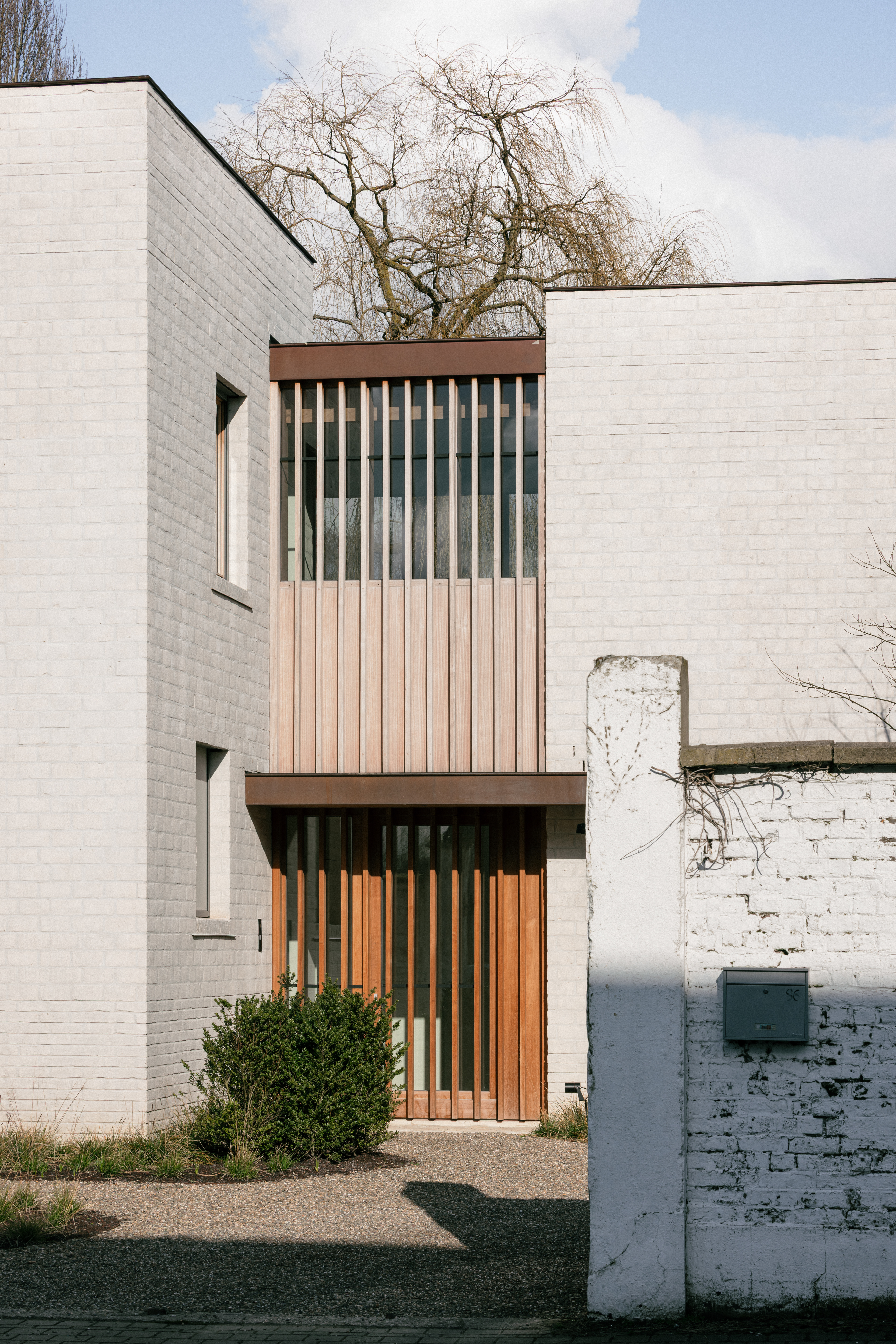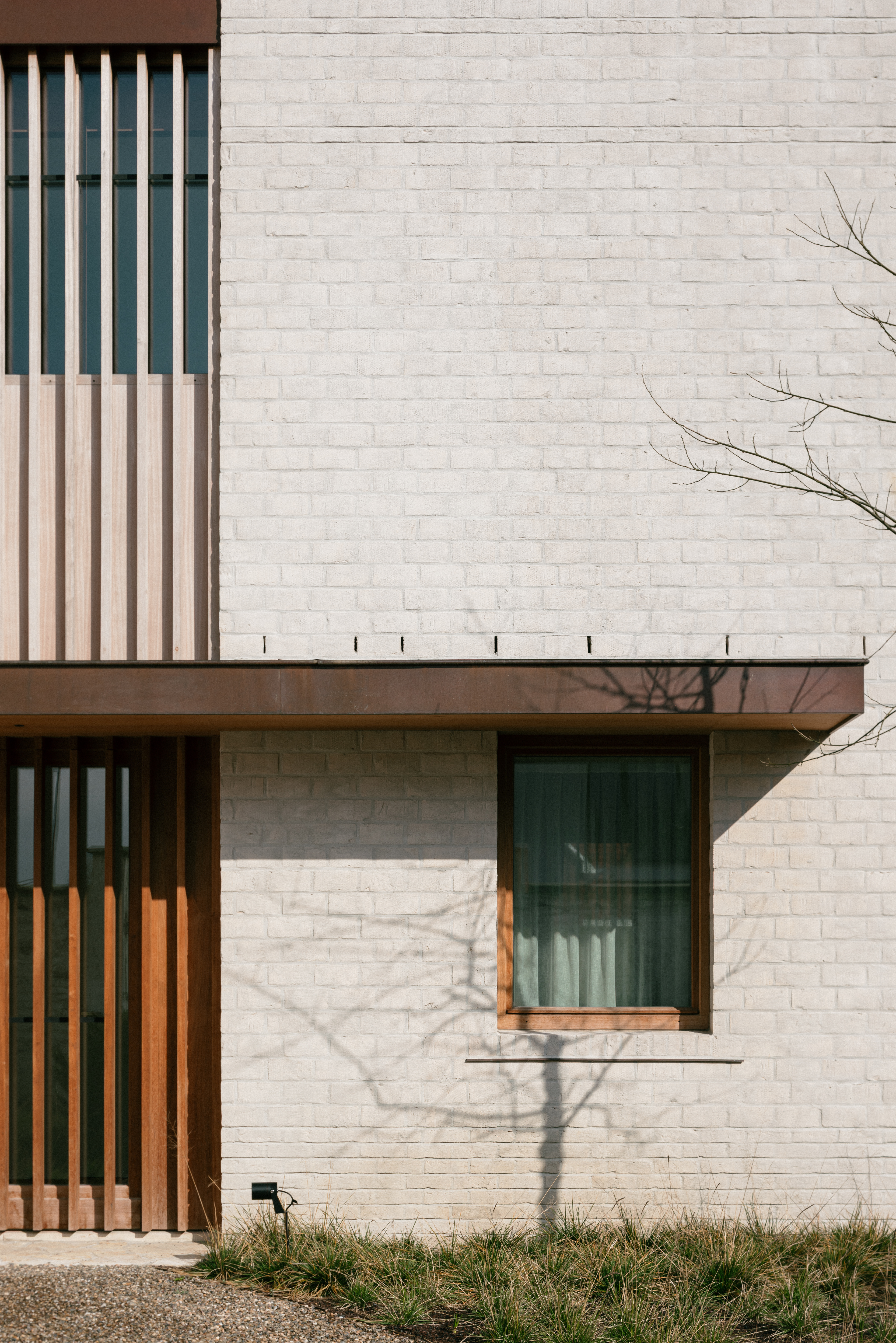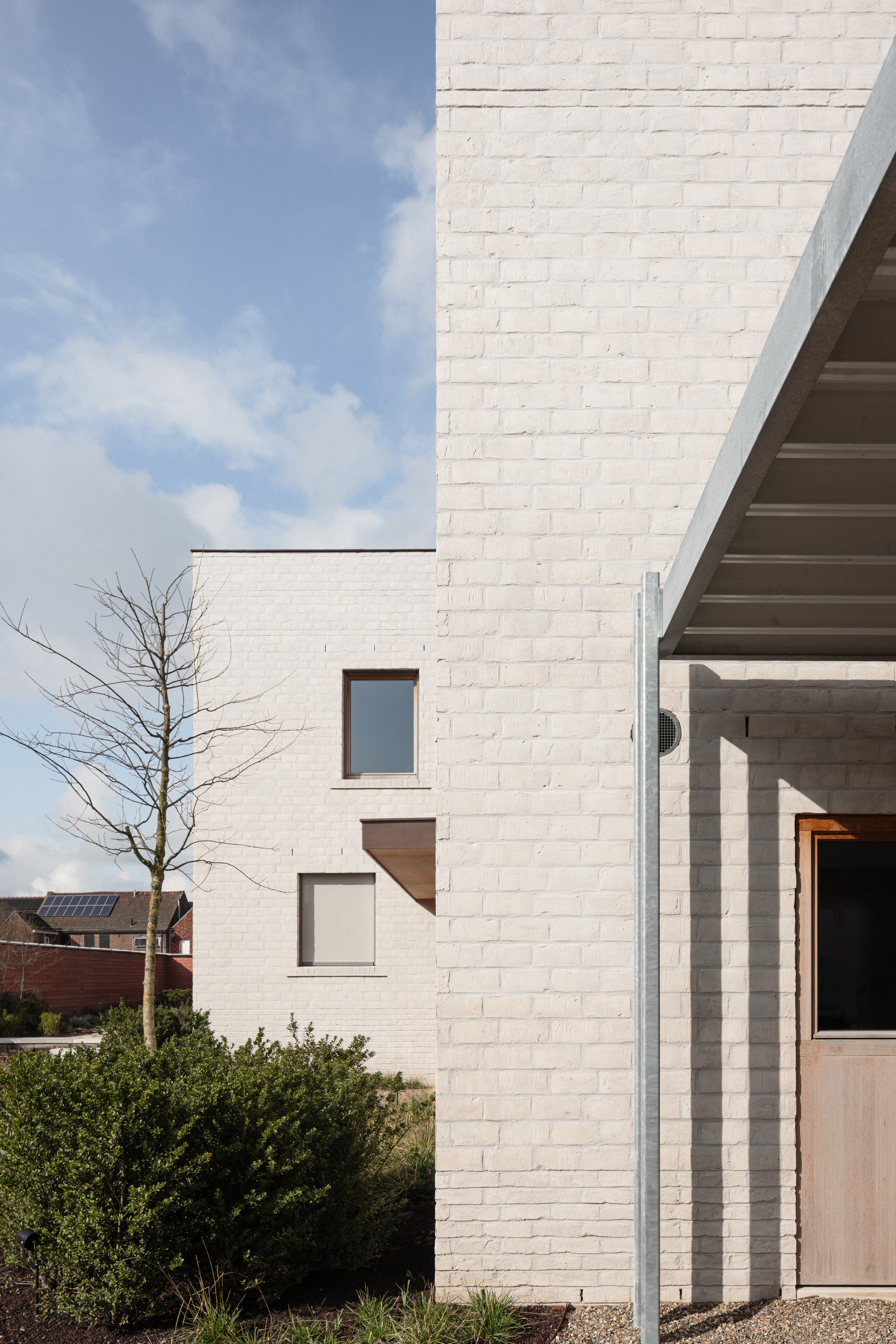 De gevels zijn opgetrokken uit een beige-witte gevelsteen van fabrikant Wienerberger. Subtiele variaties in het metselwerk verband en in de voegen doorbreken het, op het eerste gezicht, erg massieve karakter van de gevels. Onderaan de bouwvolumes wordt de steen over een hoogte van ongeveer 50cm ‘traditioneel’ op zijn breedte van 9cm gemetseld. Hoger op is de steen op zijn kant van 6cm gedraaid zodat het steenformaat groter lijkt en het grotere, ruwe oppervlak van de steen met puntsgewijze markeringen en oneffenheden van de transportband zichtbaar is. Bovenaan worden nog drie banden met de steen op de zijkant toegevoegd als bekroning. Na het voegen wordt cement voegmengsel over het oppervlak van de gevelsteen uitgesmeerd wat het sterke grafische patroon van het klezoorverband doorbreekt en de afzonderlijke bakstenen laat samensmelten. De bakstenen, gemaakt uit klei, krijgen zo een wolking en kleurnuances zoals deze vaak in natuursteen voorkomen. Bovendien geeft deze ruwe cementsluiter de passant de indruk dat deze woning hier al meerdere jaren staat laat ze ook goed aansluiten bij de oude loods. In de verdiepte voegen, telkens gekoppeld aan de banden met slankere stenen, ontstaat een subtiel schaduwspel dat meer of minder waarneembaar is afhankelijk van de stand van de zon. Als ontwerpers zijn we voor dit project bewust op zoek gegaan naar een hedendaagse interpretatie van historische baksteen details die getuigen van vakmanschap en - trots. Door deze uitdrukkelijke keuzes te maken op vlak van volumes, materialen, texturen, voegtechnieken, enz streven we een nieuw gebouw na met een ‘oude ziel’, met een duidelijk zichtbare identiteit die het 'nieuwe' ontwerp onlosmakelijk verbindt met het historische karakter van de plek waar het staat.