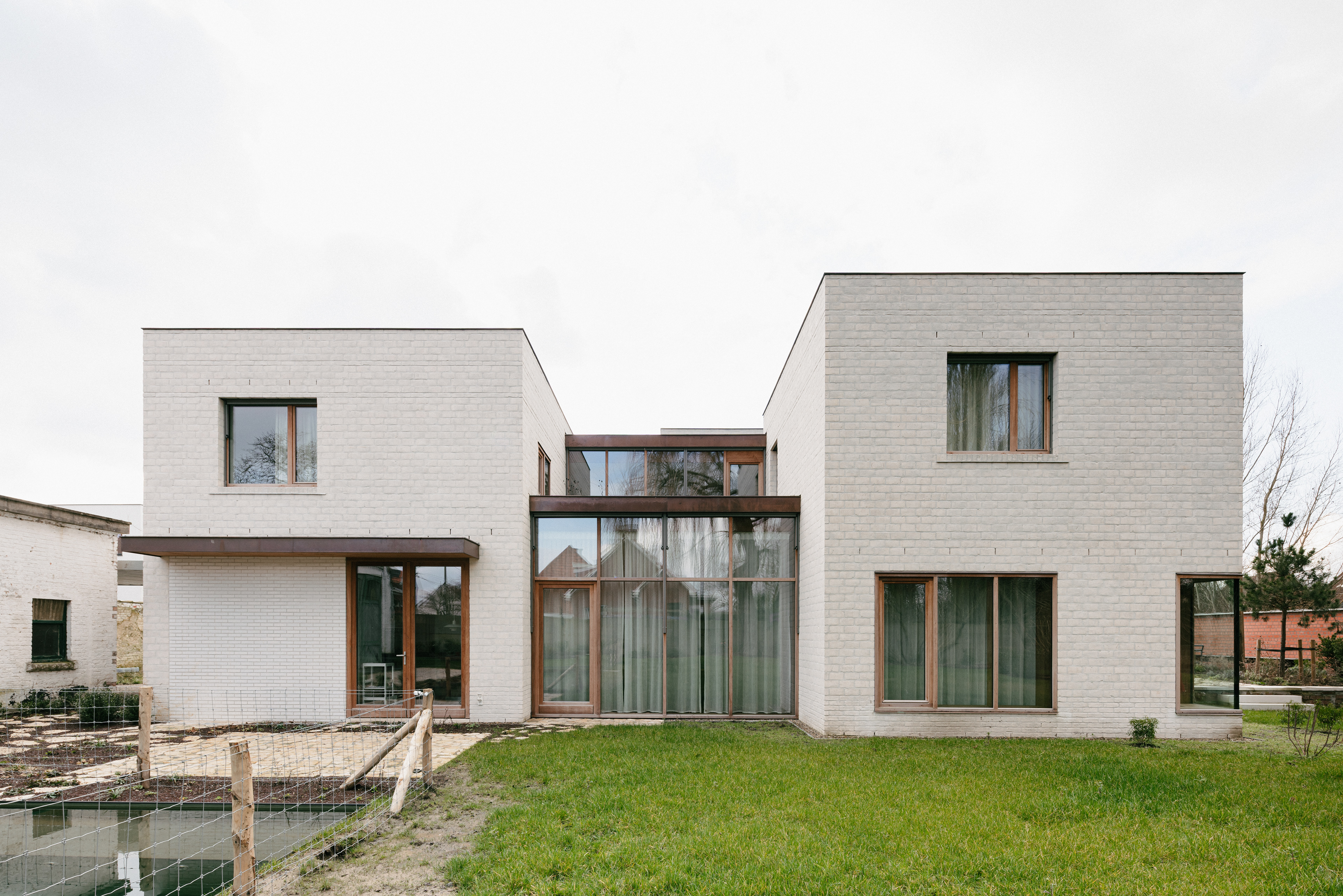Het tegenovergelegen appartementsgebouw, de vele directe buren, het lange vista langsheen de drukke weg en de nabije spoorlijn vragen om een ontwerp die zich voldoende weerbaar opstelt ten opzichte van deze directe omgeving om zo het gevoel op te roepen van een geborgen, veilige woonomgeving. We kozen ervoor om de drie baksteen volumes, die elk twee verdiepingen tellen, met diverse hoogtes op te trekken. Zo wordt een te statig, monotoon karakter doorbroken. De hogere dakranden verbergen de zonnepanelen op de platte daken. De raamopeningen in de baksteen volumes werden bewust relatief klein gehouden met uitzondering van een raam in het gelijkvloerse bureau en twee ramen in het salon. Het zijn de twee verdiepingen hoge houten afzelia vliesgevels, beide geklemd tussen twee baksteen wanden, die de tuin in het interieur van de woning binnen brengen.