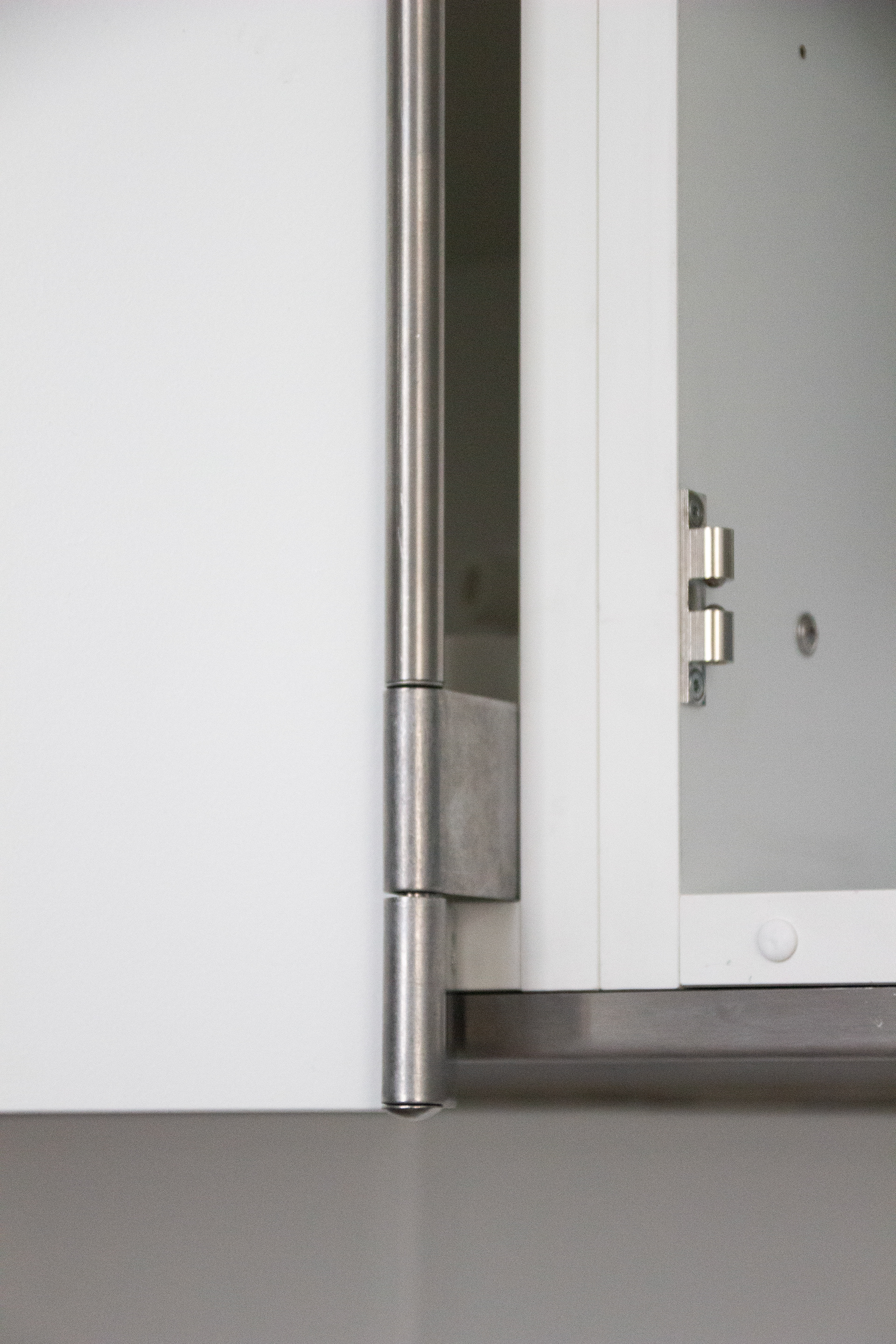 De paumelles van de hangkast worden zichtbaar ingewerkt tussen ronde buisjes in roestvrij staal. De expressieve paumelles linken zo het nieuwe kastmeubel aan het historische schrijnwerk van de burgerwoning gebouwd in 1892 waar de scharnieren werden ingewerkt in de detaillering van de vaste houten kaders. De slanke lijnen in roestvrij staal geven de kast verticaliteit en reflecteren subtiel het invallende licht.